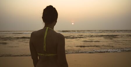 Back view of unrecognizable female in swimwear standing on beach near waving sea in evening on resort