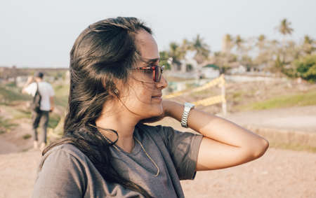 Concept of Young and innocent, Cute smile and beautiful girl face close up portrait photograph. Dark Black haired girls face side view. Pushing her hair back as the breeze hit on the sunny warm day.
