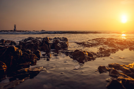 Beautiful sunrise over the beach in long exposure. Moving elements sunrise and wave photography from the rocky beach in india. Red sky in bay of bengal , slow-shutter Sea Waves and Rocks photography.
