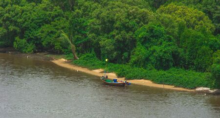 The beautiful nature of the state of Goa near the Palole beach at sunset and fishing boats. India. Drone view