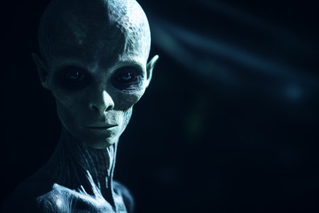 A close up of an extraterrestrial looking directly at the camera with intense eyes, showing its unique features.