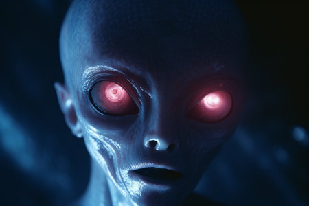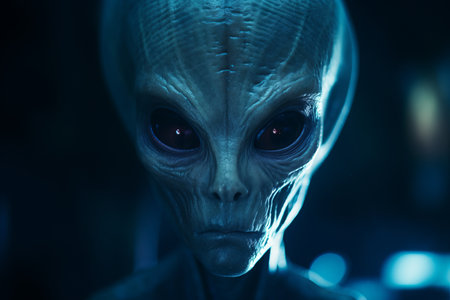 Extraterrestrial being with glowing blue eyes in a dark universe