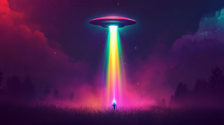 UFO hovering over field with rainbow beam at night, mysterious encounter concept