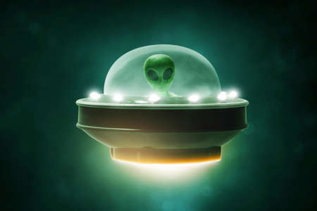 Extraterrestrial flying object. UFOs and earthlings. Contact of parallel worlds. Futuristic technology concept. Digital illustration.