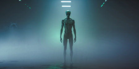 AI Generated. Mysterious alien figure captured in a dimly lit extraterrestrial setting