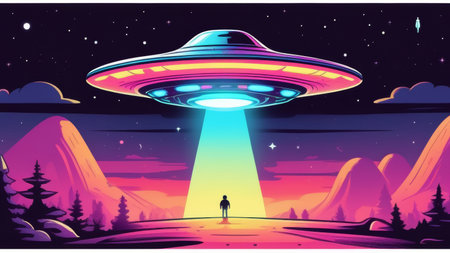 A vividly rendered unidentified flying object emits a powerful beam of light against a dark, atmospheric space background, conjuring a sense of mystery and intrigue.