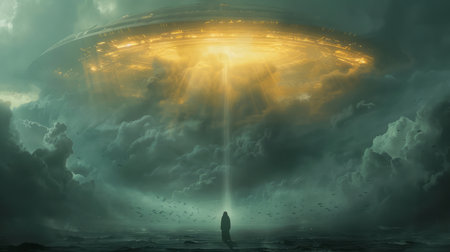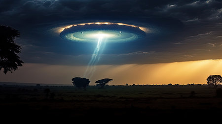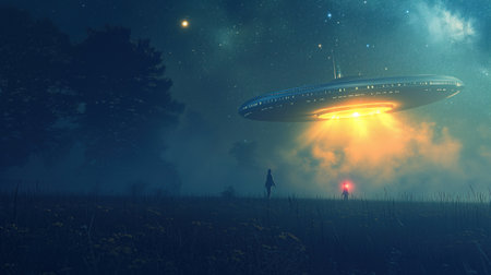 In a breathtaking celestial tapestry, an awe-inspiring UFO hovers over a vast field, casting an ethereal beam of light towards Earth As the night sky erupts with vibrant stars and dramatic clouds, the enigmatic presence beckons observers to witness an extraordinary alien encounter AI Generative