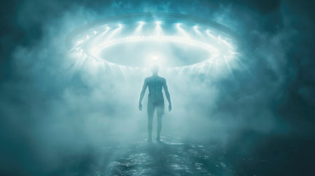 Silhouette of a person standing in a field at night, observing a bright, glowing UFO hovering in the starry sky above