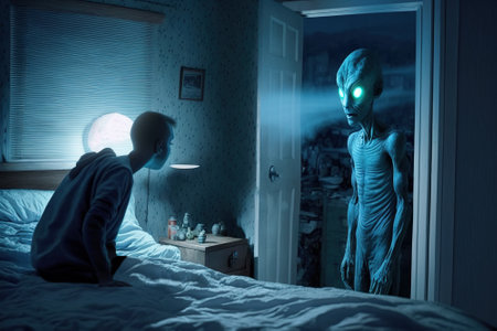Alien humanoid visits man in his bedroom at night, illustration, generative AI. Spooky gray extraterrestrial creature from another World. Concept of ufo, paranormal, horror, x-files, abduction, space