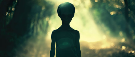 Alien, extraterrestrial being, creating tension in horror movies, mysterious encounters, silhouette lighting, Vignette, Depth of Field bokeh effect, Over-the-shoulder shot