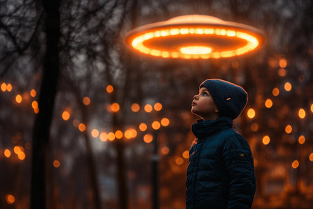 In the twilight, a young boy gazes upwards with wonder as a glowing object hovers overhead. Surrounded by soft lights, his expression reflects awe and imagination, drawing viewers into the mystery.