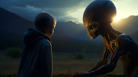 An AI generated illustration of an extraterrestrial alien conversing with a child in a desert landscape