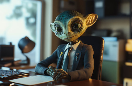 A cute alien in a suit sitting at a desk, with an office background, realistic photography, cinematic lighting, and real details. --ar 62:41 --v 6.1 Job ID: 3d4afcfe-cce6-44c5-9cc9-4f76b15b9817