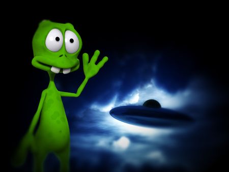 An image of a cartoon alien waving at a UFO.