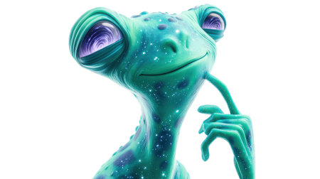 Charming cartoon alien character pointing in a whimsical 3d render style portrait photography