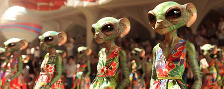 A visually striking 3D depicting an alien fashion show featuring models showcasing the latest vibrant tropical inspired outfits and trends from their unique planetary culture The scene is colorful