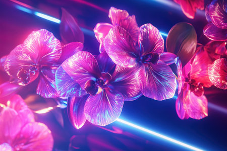 Neon orchid flowers glowing in vibrant pink and purple light with lush petals emitting modern futuristic shine. Beautiful contemporary botanical background, for interior decor or creative projects.