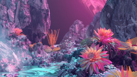 Surreal Neon Landscape with Vibrant Flowers and Jagged Rocky Terrain
