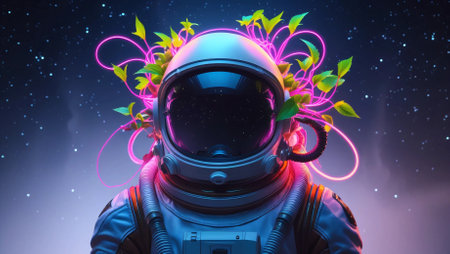 A futuristic digital artwork featuring an astronaut floating in space, with vibrant green plants growing from their suit. The image symbolizes the fusion of nature and technology, depicting a possible future where life expands beyond Earth