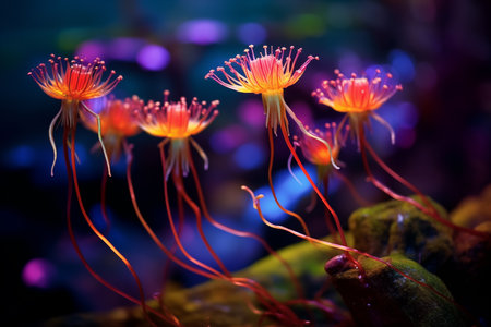 Experience the enchanting beauty of vibrant bioluminescent coral flowers glowing in a dark aquatic setting, capturing the wonders of marine life and organic design.