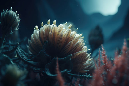 Wonderful aquatic life in ocean seabed. anemones. Coral reef design. Generative AI. Illustration for banner, poster, cover, brochure or presentation.