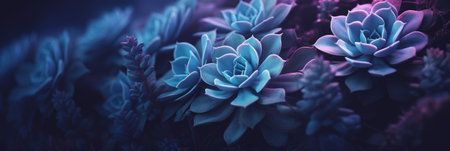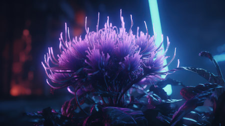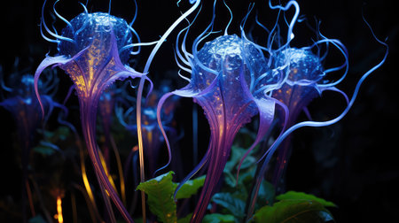 The image showcases abstract glowing flowers in a dark setting. The flowers have a blue and purple luminescence with ethereal light. The composition features a shallow depth of field, with light effects. This image is suitable for commercial and editorial applications and can be used to represent concepts such as fantasy or science fiction.