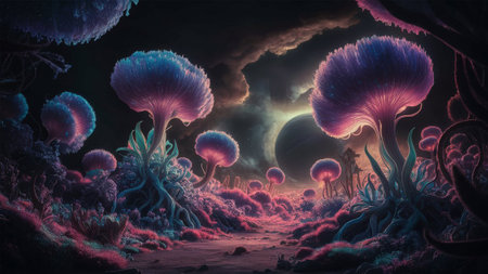 A fantastical alien like garden filled with glowing ethereal blooms and vibrant kaleidoscopic flora in a captivating cosmic dreamscape This surreal