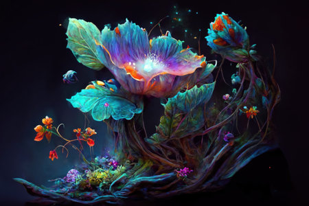 glow beautiful flowers on dark background. Generative AI