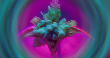 Ink vapor. Flower smoke. Art fluid spill on fresh lily natural petals. Haze multicolor dye blend on neon purple gleam circle background.
