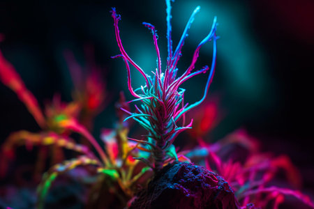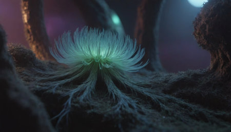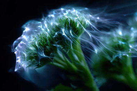 A plant sprouting luminescent tendrils in a dark background creates a mystical atmosphere.
