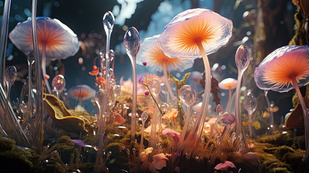 Mushrooms in the aquarium. 3D illustration. Fantasy.