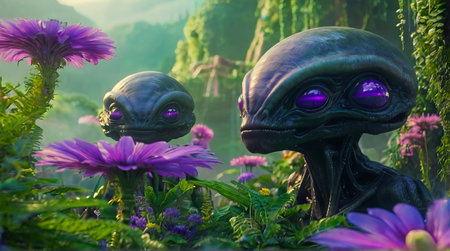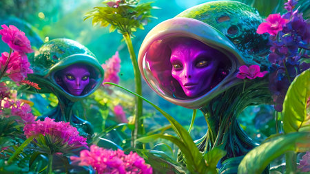 Whimsical Aliens with pink flowers in a vibrant garden. Extraterrestrial beings blending with floral surroundings. Concept of alien life, nature, science fiction, botanical fantasy.
