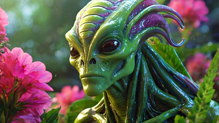 Alien with tendrils and pink flowers in a garden. Extraterrestrial creature among vibrant plants. Concept of alien life, nature, science fiction, botanical design.
