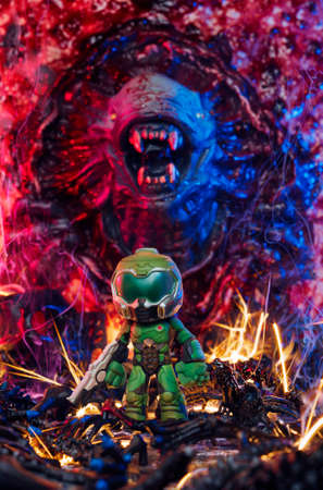 MAGNITOGORSK, RUSSIA - March 24, 2019: a single Doomguy figurine, which represents a protoganist from the computer games series Doom. The explosion effect is real and created using sparklers. Illustrative editorial.