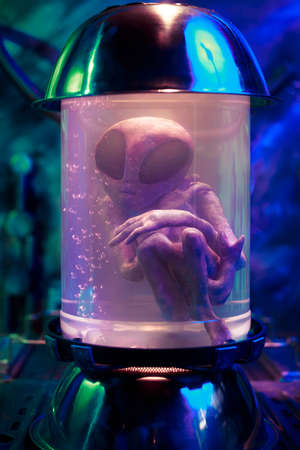 An alien float in a green gurgling liquid in a special glass aquarium in a futuristic laboratory. The image is ideal for sci-fi or space travel. The concept of an alien and laboratory. 3D rendering