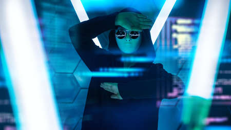 A portrait of teenage boy in a black hoodie, mask and black sunglasses hiding his face works with holographic data on virtual screen. Studio shot among neon lights. Teen hacker in cyberspace.