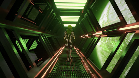3d Illustration of an alien with red eyes in a starship corridor staring forward.