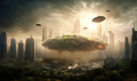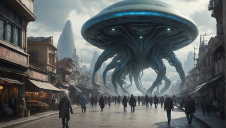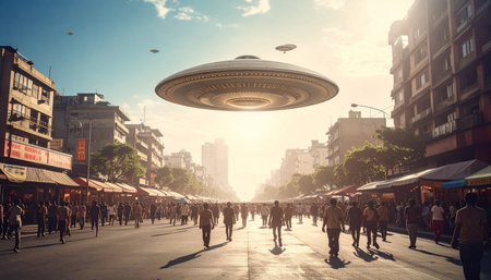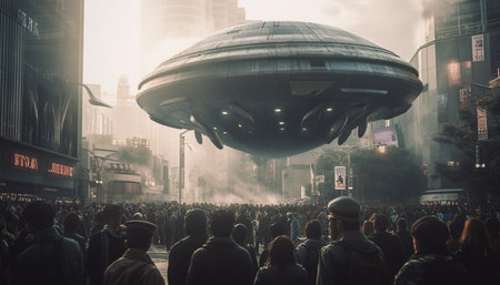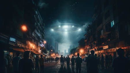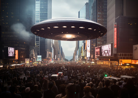 UFO mothership flying over the people in the busy city. cinematic ufo day concept