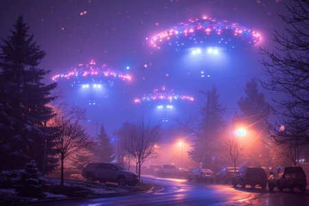 Mesmerizing winter night scene with glowing UFO lights over snowy neighborhood. Concept of alien visitation, extraterrestrial phenomenon, and otherworldly mystery