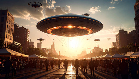 A city skyline with people looking up at the sky, an alien spacecraft is hovering in front of them and casting light on their faces. There are other unidentified flying objects (UFOs) flying around it. It is dawn time, in the style of realistic photography. --ar 29:39 --v 6.1 Job ID: f867a92f-65d1-4168-9d83-2dd82aaa0a73