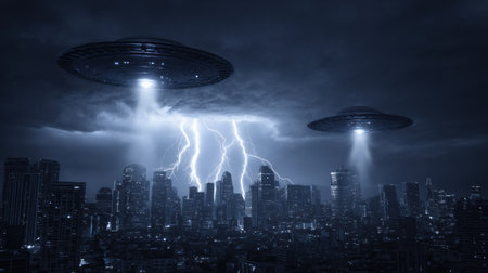 A dramatic scene unfolds as lightning strikes illuminate the night sky while UFOs hover over a city, creating an intense and otherworldly atmosphere.