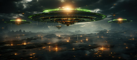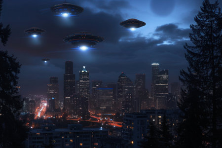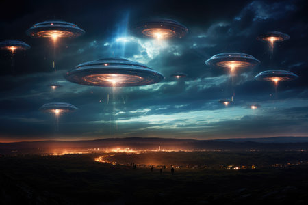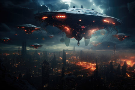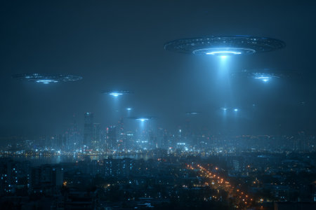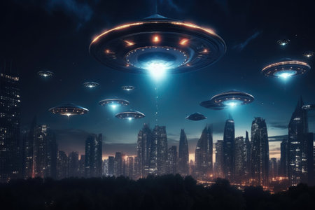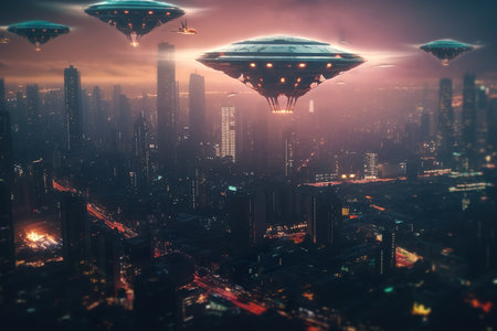 Futuristic cityscape at night with glowing ufos hovering above, creating a mysterious and otherworldly atmosphere