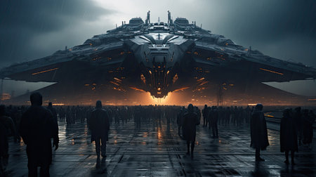 A wide shot of a spaceship landing on a planet. The spaceship is large and imposing, and it looks like it could be from another world.. Generative AI