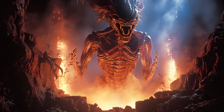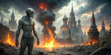 A golden alien being gazes intensely, surrounded by flames and a burning environment filled with chaos.