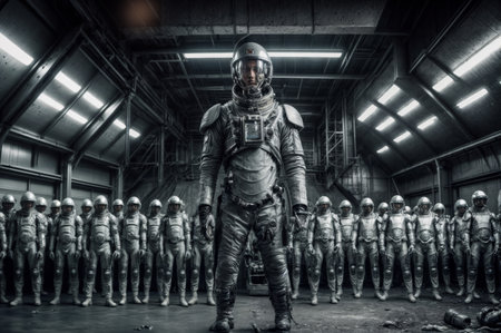 Woman in futuristic suit standing in front of group of other humanoids. Generative AI.