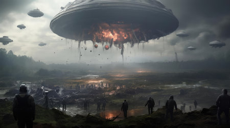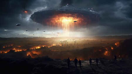 Ufo crash site open field artistic photo illustration scorched ground with smoke and fire