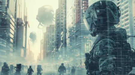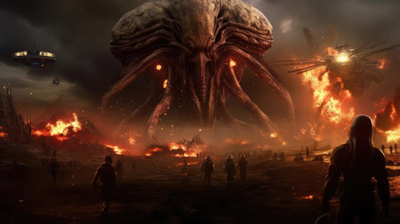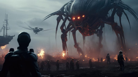 Aliens in a city. Futuristic fiction attack. Generate Ai