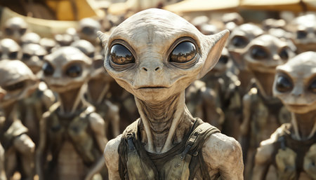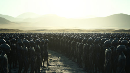 Large group of aliens standing in formation on a vast desert landscape, bathed in the warm glow of the rising sun, creating a scene of otherworldly presence and anticipation