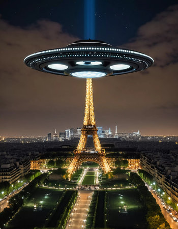 A disc-shaped UFO hovers above the Eiffel Tower in Paris as the sun sets, casting a warm glow across the cityscape and illuminating the iconic landmark. Generative AI.