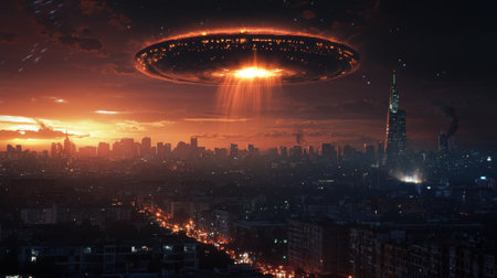 At midnight, a group of flying saucers soar over the city, lighting up the sky with their presence, creating a surreal atmosphere
